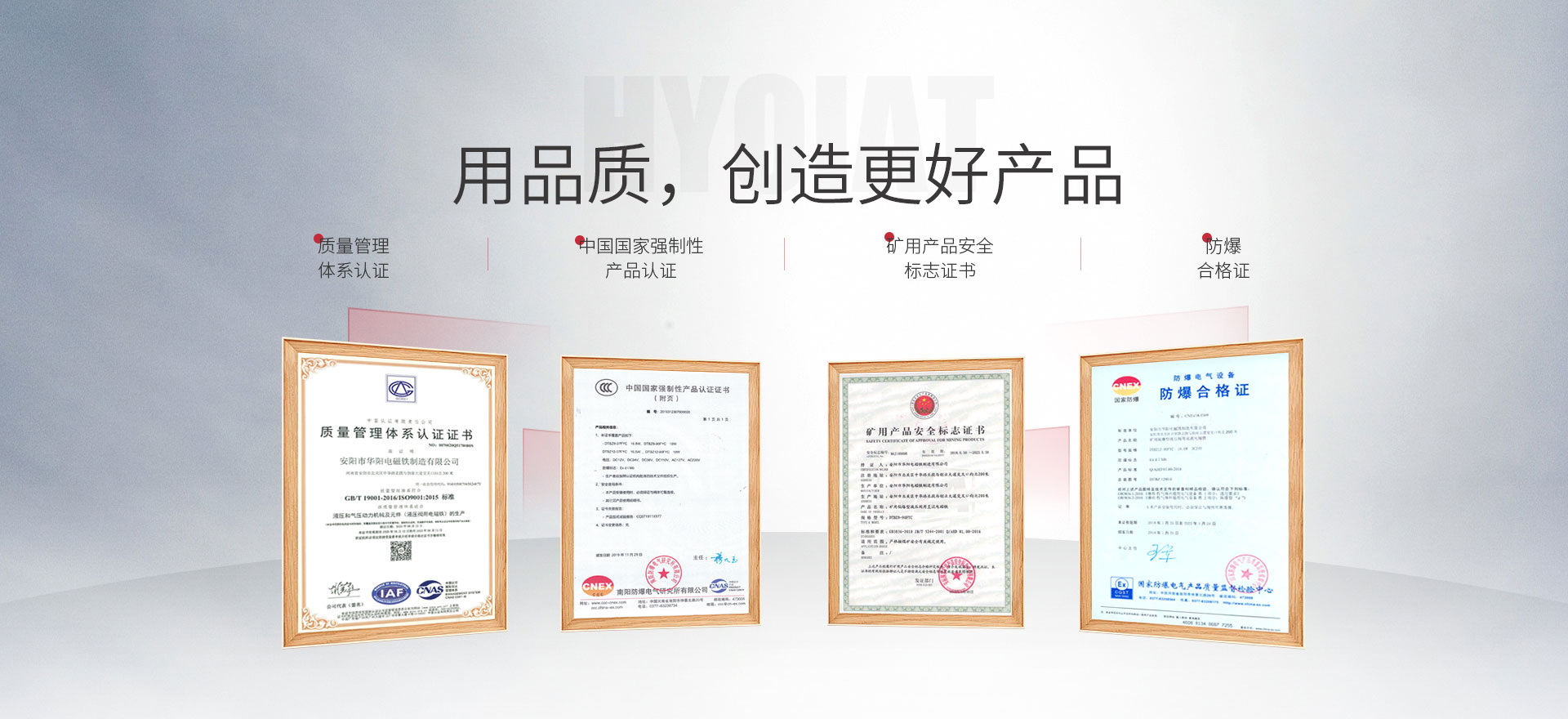 公司已通過ISO質量、環境、職業健康管理三體系認證,IATF16949: 2016質量管理體系認證,CE認證,Ⅰ類、Ⅱ類和Ⅲ類防爆產品認證等,擁有多項科技果及數十項專利,并建有“河南省液壓閥用電磁鐵工程技術研究中心”、“河南省企業技術中心”。